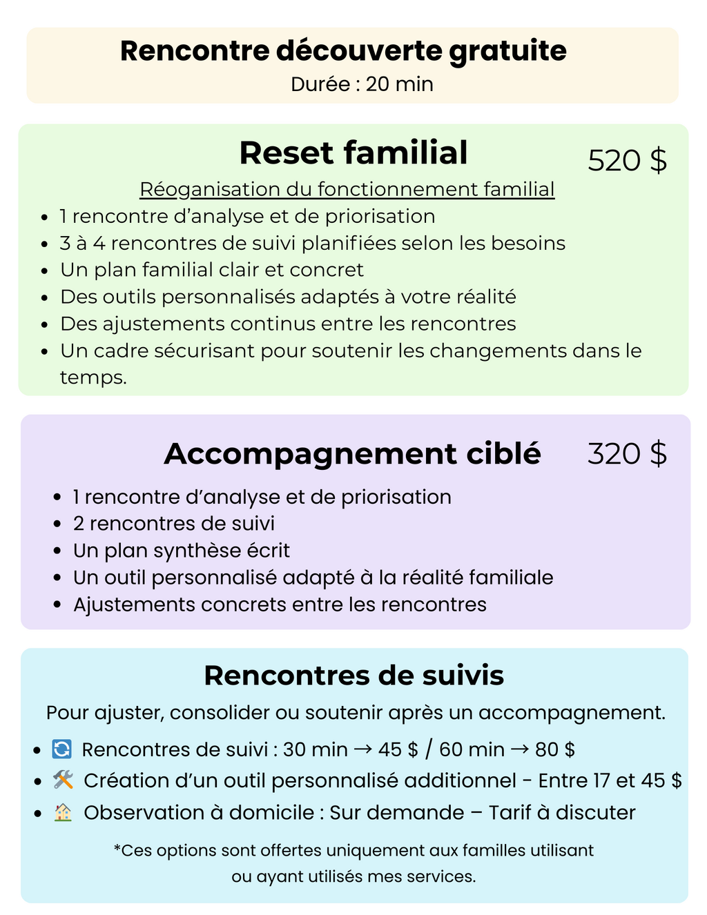Il s'agit d'un accompagnement planifié dans le temps, pensé pour soutenir les changements et les ajustements nécessaires selon votre réalité familiale.